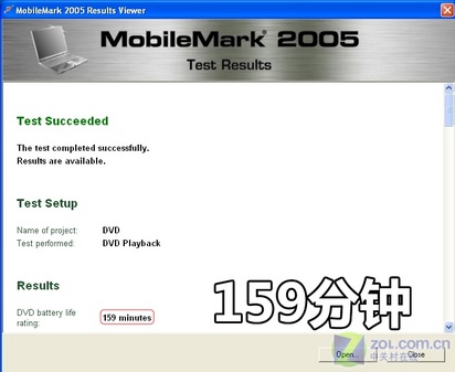 在进行MoblieMark2005测试前,我们将电池完全充放3次,以达到电池激活的最佳状态,在BIOS中将电源管理关闭,保证CPU处于全速的工作状态。
