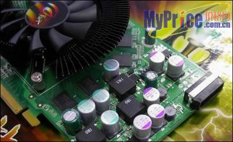 翔升权杖7900GS显卡的PCB布局非常专业,供电模块的用料水准相当高,全部采用了贴片工艺固态电容以及全封闭的抗干扰扼流线圈,为显卡提供了纯净稳定的电流,使得显卡的稳定性得到保证。