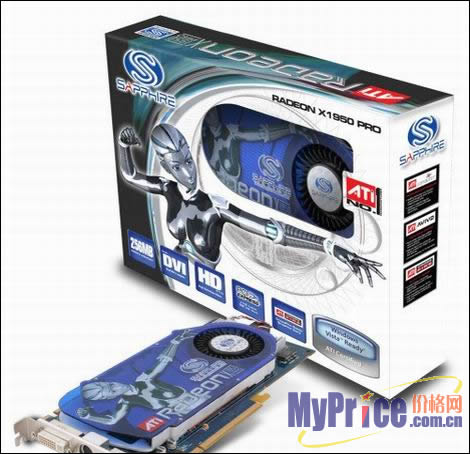 蓝宝石Radeon X1950Pro显卡同样基于80nm制程的RV570核心。这款显卡使用了1.2ns的GDDR3显存颗粒,显存规格为256MB/256bit,默认的核心/显存频率为580MHZ/1400MH。随卡附送桥接连接器,非常方便使用双卡并行的用户。这款显卡不仅完整地支持DirectX9.0c、shader model 3.0、Avivo、HDCP等技术以外,还新增了对Native CrossFire模式的支持。显卡核心内部整合了CrossFire合成引擎,组建CrossFire再也不需要购买主卡了。