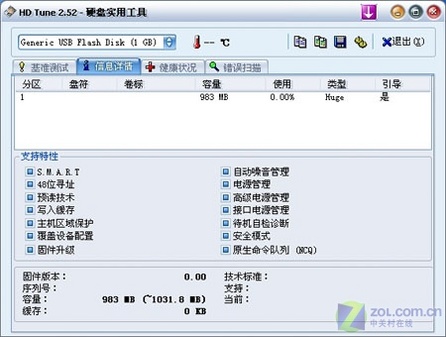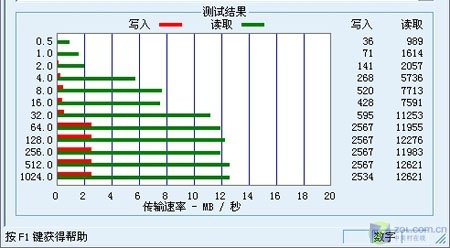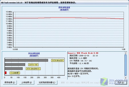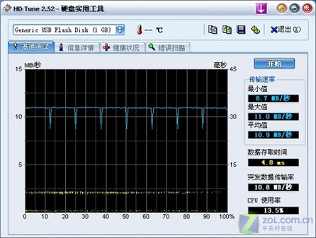 HD Tach是一款常用的硬盘测试/对比工具。经过测试后笔者发现,该款移动U盘读取性能非常稳定,平均读取速度12.4MB/s;突发读取速度13.4MB/s,读取速度尤其令人满意;而随机存取速度只用了4.9ms,在移动存储中算是可圈可点;同时其8%的CPU占用率也十分理想。