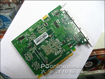 而提到大家关心的显存部分,由于散热器是采用螺丝固定的,因此笔者在没有工具的情况下也无法直接观察到显存的表面参数,但从厂家资料中我们了解到,这款显卡采用的是双128显存配置,显存速度为1.2ns,默认频率高达500/1500MHz。