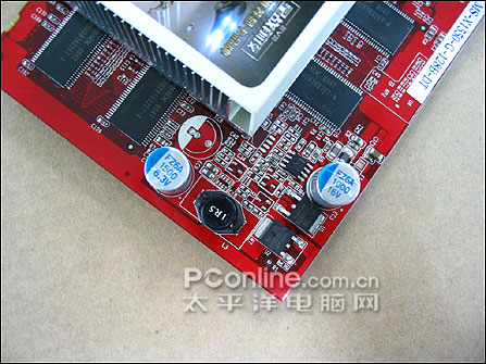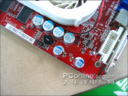 由于这是一款针对入门级市场所推出的显卡,所以铭?只为其搭配了DDR1显存,能够更好地控制生产成本。产品正反面共覆盖了八颗TSOP封装的Hynix 4ns显存,组成双128主流规格,额定显存频率为400MHz,还有一定的超频空间。