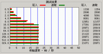 由上图可以看出,采用4M的测试数据包,按不同大小的文件进行读写测试,M800的写入和读取分为维持在21MB和20MB左右,在MP4产品中算是比较高的了。