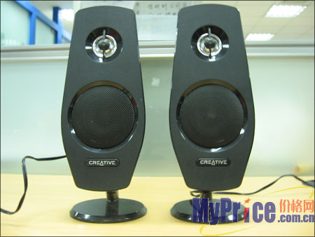 卫星箱使用的是塑料材质,采用双分频设计,上面各有两个扬声器,外面同样有一层金属防尘罩。卫星箱的下面是创新的英文LOGO,支架可以方便地进行拆卸,不过看起来稍显脆弱,背后设计了挂钩孔,可以将其挂在墙上使用,更加节省桌面空间。