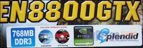 华硕8800GTX包装下方清楚地标明了显存规格、附送的软件和游戏、NVIDIA的标识、华硕独家的眩彩技术,与酷酷的外表搭配出时尚的气息。