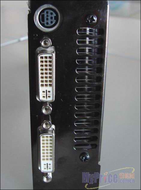 华硕8800GTX的输出接口也相当丰富,它采用双DVI-I连接,可实现双显示功能。并且输出2560x1600分辨率、双16:10宽屏幕的画面也没有任何问题。8800GTX在DirectX10时代没有真正到来之前,能一露身手的地方就是高分辨率下的抢眼表现,分辨率越高8800GTX相对于其他显卡的表现越优异。这款显卡的散热孔和TV-OUT接口在最上面,挡板为一体成形设计。