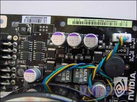 华硕8800GTX的供电模块部分使用了三洋固态电容、封闭电感、大量的MOS,保证了这个吃电大户能发挥性能。它的功耗为180W左右,PCI-E插槽提供的75W是绝对不够用的,有2组PCI-E 6-pin电源接头为它供电,所以450W以上的电源是运行8800GTX的基本要求。