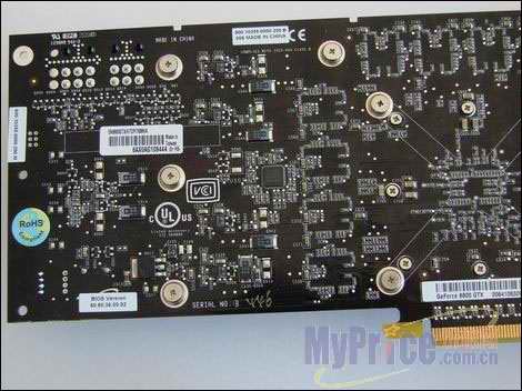 涡轮风扇上面有华硕的镭射LOGO,根据显卡最上面的流水线号推测出这款显卡的生产日期大概在06年10月份,显卡背面不同寻常之处是密密麻麻的11颗大螺丝,用来固定那个大风扇。背面贴有产品流水编号、BIOS版本、型号信息、还有欧盟的ROHS标签,看来这款显卡虽然庞大但非常环保。