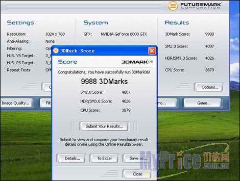 3DMARK06分数意料之中在一万左右,一般来说3DMRAK打破一万分时也就是新版本即将推出之时,相信在3DMARK07的DirectX10场景中华硕8800GTX的测试分数会更有优势。
