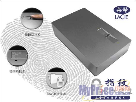 在2006年已经火了一年的指纹识别市场又传来了爆炸性消息,世界知名电脑外设品牌,世界移动存储的领航者“莱希LaCie”公司旗下的最近指纹桌面型正式上市大陆地区。容量最高达500GB的指纹保护硬盘,配合其最大120GB的便携型指纹硬盘,在2007年出打出了指纹系列产品普及的第一弹!