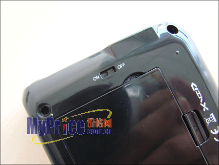 N4301的机身背面就显得不那么“工整”了,GPS模块被设置在了左侧,比较具有亮点的地方是GPS模块的顶端设有一个外接插孔,小巧典雅且不占据空间,不过有一点需要注意的地方,这个外接插口如果不仔细留意的话,一般人是不太会发现的;而右侧则是一块可拆卸锂电池,在电池的右边则安置了一个电池ON/OFF开关,不过编辑在拿到机器时发现这一开关似乎是虚假设置,里边并没有操控键和触碰键,编辑在经过多种尝试后,始终没有找到该设置的用途,N4301的这一设计未免有点画蛇添足的嫌疑。