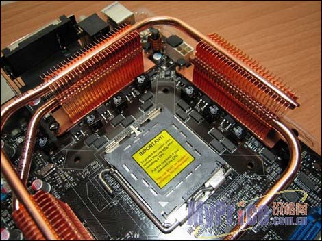 这款产品的包装颜色深沉而大气,主板给人的第一印象是就是尊贵奢华。这款主板使用全固态电容,关键的CPU供电部分使用了贴片电容,为12相供电。南北桥和CPU供电附近分别由大型铜散热片覆盖,并且有热管将这些散热片互相连接,充分保证了散热效果。