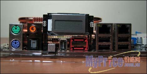 接口附近有独特的电源总开关和显示系统检测信息的荧光液晶屏,使用者可以直接看见系统检测反馈的信息,而不用靠Debug检测卡上显示的代码来识别,在完成系统检测进入操作系统后这个屏幕会关闭,当系统运行有故障或者有情况发生时它会再次启动并显示信息。这款主板有1394火线,两个ESATA,两个千兆网络和4个USB2.0接口。