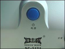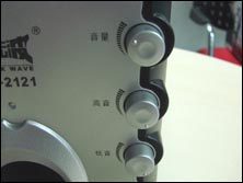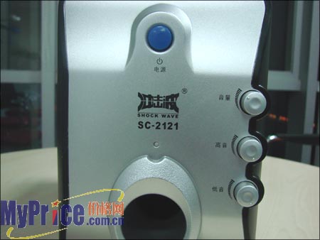低音炮的前面板设置有蓝色的电源开关,右侧是一字排开的音量、高音和低音调节旋钮,调节旋钮的阻尼适中,手感非常不错。前置设计能够大大方便操作。倒相孔和电源开关中间是电源指示灯、冲击波的LOGO和音箱型号,整体布局还是很合理的,看上去比较简洁明了。