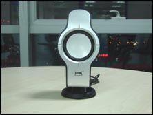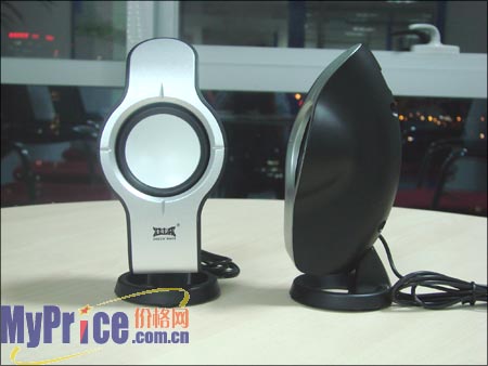 卫星箱同样采用前银后黑的颜色搭配,扬声器采用的是2.5英寸的全频带喇叭,振膜是纸盆材质,扬声器下面是冲击波的LOGO。