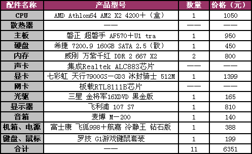 近期,迫于Intel超频杀手上市的发布,在装机市场中坚挺的双核速龙 4200+也不得不下调价格,目前已降到1100元以内,这无疑又成为广大游戏爱好者最为关注的AMD处理器之一。下面就让我们来看一款基于AMD平台的玩转《极品飞车10》的6351元配置。