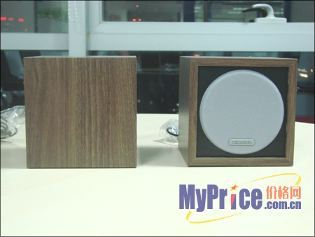 两只卫星箱的造型与低音炮没有太大区别,同样是深褐色的木质箱体,白色的防尘罩,防尘罩底部有麦博的LOGO。卫星单元自然采用其引以为傲的2.5寸口径V12全频扬声器。