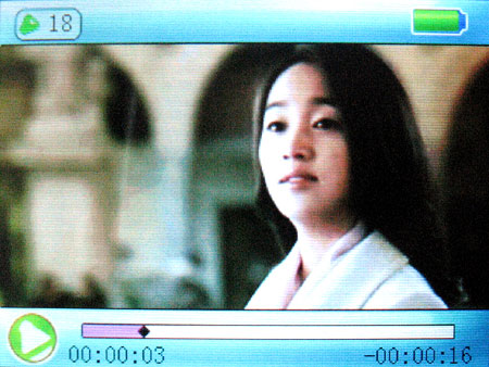 虽然屏幕仅为2英寸,但由于Q10采用的是Rockchips RK2606A芯片,因此视频格式同样可以达到每秒24F/S画面的播放,它采用XVID编码的AVi视频,全屏幕播放显示,外音喇叭播放,画面显示效果也达到了上述几款机型的水平。 |