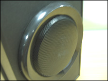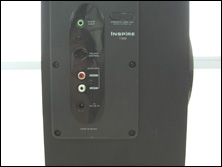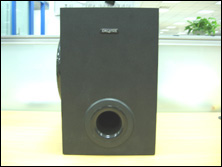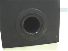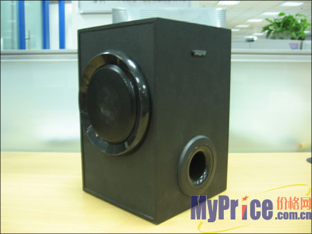 音箱的低音炮采用木质材料,正面面板的上方是创新的经典LOGO,下半部分是外廓的倒相孔,左侧设置有5.25寸长冲程的低音单元,外面是一层金属防尘罩,可以有效保护低音单元。音箱的插口都集中在箱子的背面,包括音频输入口、线控接口、左右音频输出口及电源接口。