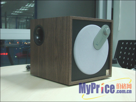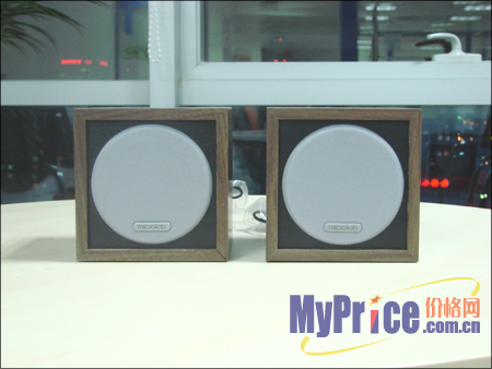 两只卫星箱的造型与低音炮没有太大区别,同样是深褐色的木质箱体,白色的防尘罩,防尘罩底部有麦博的LOGO。卫星单元自然采用其引以为傲的2.5寸口径V12全频扬声器。