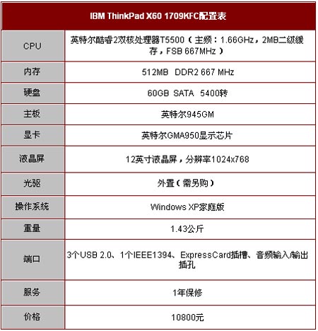 点评:作为IBM行货,10800元的价格确实再创IBM X60的价格新低。ThinkPad X60采用了三级散热设计,使用全速酷睿2处理器和2.5英寸5400转硬盘发热量依然控制的很好。本款笔记本没有内置光驱给使用者带来了不便,不过也少了一个噪音源与不稳定因素。
