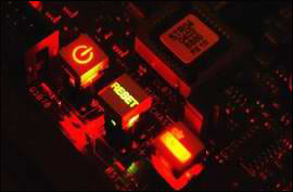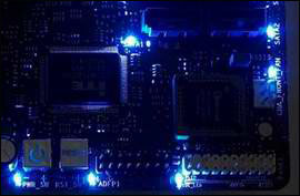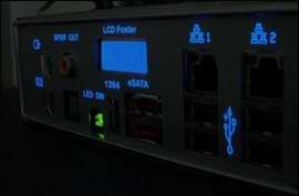 超凡的人性化设计是华硕赢得众多消费者信任的原因之一,STRIKER EXTREME为用户打造了Power、Reset、Clr CMOS三个按键,这种人性化的设计真正把超频变成一种乐趣,三个按键搭配了夜光设计。不同于公版的680i SLI,STRIKER EXTREME上面采用了LCD液晶显示,不仅支持背光功能,还提供了侦错、功能指示以及时间/日期显示等,同样搭配了夜光设计。整片主机板的外圈也加设了高亮度的蓝色SMD LED,夜晚的效果非常COOL,这款“夜光”主板配合透明机箱可以营造出超眩的效果,充分满足用户的个性化需求,小编强烈推荐用户使用透明侧板的机箱搭配这款主板。