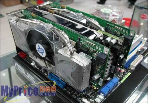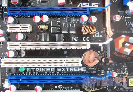 玩家国度STRIKER EXTREME主板上的3个PCI-E插槽已经不算最多的,数量的多少只是表象,以技术而论STRIKER EXTREME是物理加速主板的先锋。STRIKER EXTREME两旁的PCI-E插槽支持16X全速SLI,中间的8X小编估计是用来支持三卡互连的物理加速平台。大家肯定还记得8800GTX上多出的一个MIO接口,小编估计NVIDIA即将出台的物理加速卡和G84、G86家族同样具有两个MIO接口,这样就可以组成所向无敌的物理加速平台,游戏世界将任你驰骋。