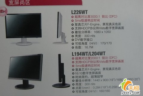 则款LG配备锐比技术的L226WT拥有了3000:1的超高对比度,这也是迄今为止民用液晶最高的对比度。此外,这款机型还支持HDCP协议,内置复真芯片、提供170度的宽可视角度、数字接口和16.7M的色彩显示。