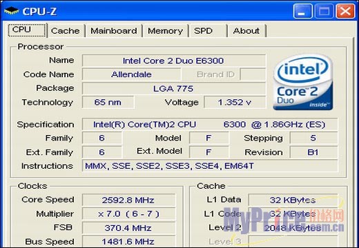 在超频测试中我们选用了酷睿家族中最具超频潜力的E6300作为测试对象,七彩虹C.P965-MVP Ver2.1基于INTEL P965芯片,一般而言把外频上到350MHz是没有什么问题的,我们顺利地在默认电压下把外频上到了370MHz,这时候CPU频率为370*7=2590MHz,在拷机测试中电压稍微有所提升。