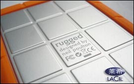 莱希LaCie这款探路者系列移动硬盘主要采用银色加橘红色为主色调,整体外观非常时尚,但是比起其它同类产品体型却毫不逊色。他采用的不是常见的铝合金轻薄外壳,而是更为坚固、轻巧的的钛铝合金面板,正面板上只印有LaCie的品牌LOGO,背面则是Rugged(探路者)的产品系列名称,及其设计师neil poulton,和此款产品所获得的各种世界质量认证标志。而边缘处套上了一个橡皮外衣,好像坚固、奇特的《超空人》中的光谱赛车,整体产品非常好看,袖珍而精致。