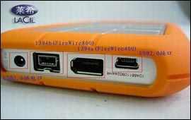 该款移动硬盘容量为160G,里面使用一块2.5英寸硬盘外加钛铝合金的硬盘外壳组成,最外面还包裹一圈无公害环保塑料皮套,具有非常好的防震防摔性能,不支持USB2.0高速传输,还支持1394a(FireWire400)和1394b(FireWire800)