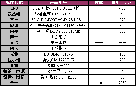 在这套配置中,我们选择了价格在500元以内的Intel 奔腾4 631 3.0GHz(散),它外频为200MHZ,倍频为15,支持800MHZ前端总线,产品支持MMX、SSE、SSE2、SSE3、EM64T,供电模块需符合05A标准。3.0GHZ主频、65纳米制程技术、2MB二级缓存、实惠的价格以及支持超线程技术均是这款产品最大的亮点,再搭配上精英的这款集成主板,能够很好的发挥出其具有的性能。