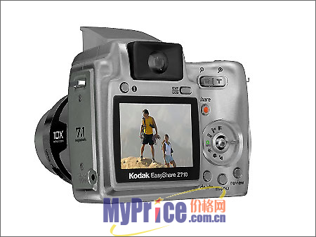 柯达Z710采用银色的工程塑料外壳,手柄和镜头外筒包有部分橡胶材质,机身做工极致精细,Z710的外形尺寸为9.78x7.75x7.26cm,重量为285克,掌握手中有一种仿专业的非凡效果;边缘部分Z710采用圆润的流线设计,它搭载了一块20.1万像素的2英寸液晶屏,水平可视角度超过170度,垂直可视角度也能达到100度左右,且显示效果出色。