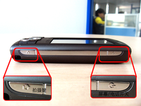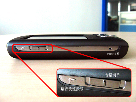 在机身两侧,P800C采用银色镀铬条做为装饰,更平添了一丝流行时尚,同时几个快捷键也设在其中。分别为:语音快捷键、音量调节键,reset孔;右侧上面是电源/屏幕开关,拍摄键。