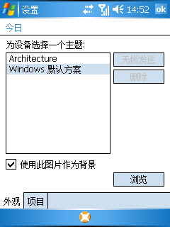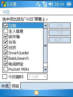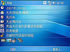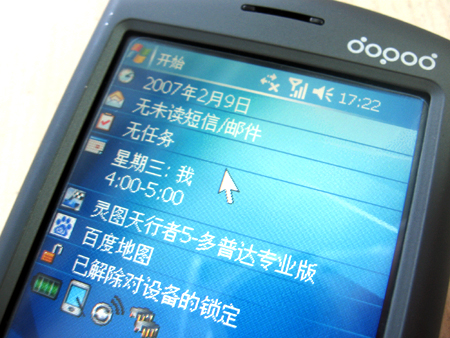 我们知道,微软视窗系统最大的特点就是“今日”主题的自定义。作为微软视窗最坚定的支持者,多普达似乎并没有学Palm对“今日”大兴土木,依然保持着视窗系统的最基本形态。只是添加了针对本机系统常用的四个快捷键,从左到右依次为电量显示、屏幕旋转、通讯管理器、内存管理器,这样就可以虽随时查看机身运行状态并随时调整,极大的照顾了用户手指。