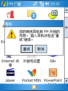 在XP上我们似乎从来没有体验到FM的感觉,不过在P800上,我们看到了这个功能。似乎是多普达首次整合改功能。同其它机型一样,FM功能需要插入耳机才能启动,由于本测试没有附带耳机,因此没有测试该功能。不过看说明书,该FM收音机可以预置20个频道。这里需要注意的是:P800的耳机居然是USB接口的,这样就和充电器或者连接电脑的数据线冲突,看来在连接电脑或者充电的时候是听不了电台了。