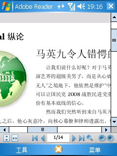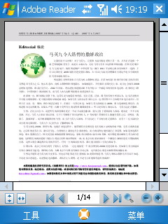 整合office办公软件一向是视窗系统面对商务人士最有力的武器,在P800上也不例外。在机器的软件上具有Word/Excel/PowerPoint Mobile等典型的office软件。另外在该机内部,还集成了Adobe Reader LE,能都阅读PDF格式文档。不过在实际阅读中视野受限。