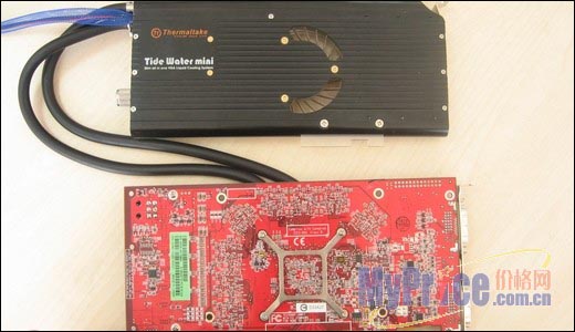 打开包装,MSI X1950XTX的尊容终于出现,显卡和散热器被黑色的管线连接在一起,采用主动热交换液冷方案,卡身和散热器做工都非常精致,互相辉映相当诱人。
