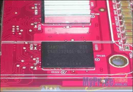 GDDR4显存是X1950XTX显卡最大的改进,与GDDR3相比,GDDR4有更大的带宽和更低的功耗,MSI X1950XTX配备的时钟为1GHz的512MB GDDR4带宽高达61.4GB/s,在高分辨率高画质的3D游戏中优势非常明显,显存颗粒采用被动散热方式,但超频能力依旧非常强劲。