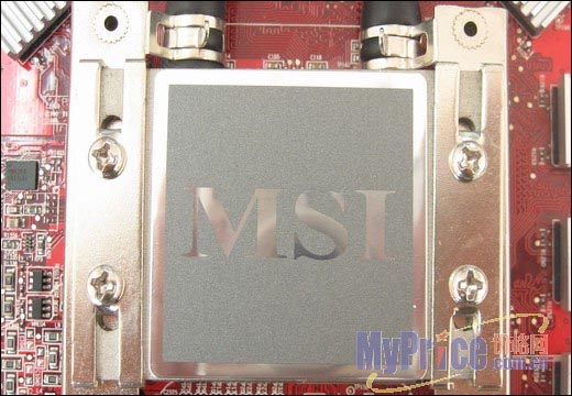 MSI X1950XTX显示核心上的散热片和输液管衔接得相当好,MSI的LOGO打在磨沙质感的散热片表面,显得特别精致,非常有艺术感。