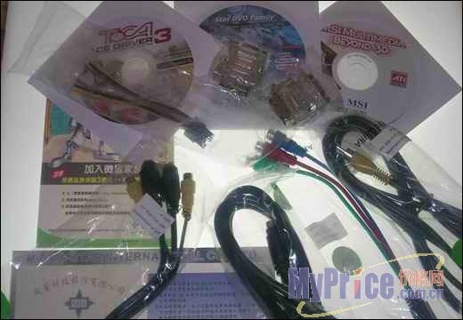 MSI板卡的附件一贯非常丰富,这款显卡除了常备的驱动、说明书、电源线、转接头之外,还附带了色差分离线,S-Video延长线、实用软件和MSI附赠的游戏光盘。