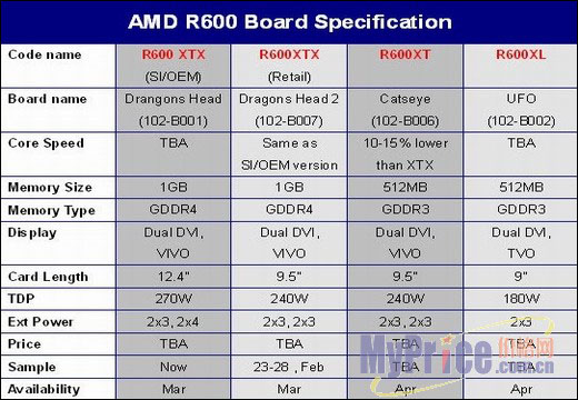 AMD将会于2月下旬向合作伙伴提供零售版本的R600XTX样本,代号为Dragons Head 2,PCB相比NVIDIA GeForce 8800GTX更短,需要两组6pin PCI-E外接电源,最高功耗为240W。此外R600还会有两款较低当次的型号,包括R600XT及R600XL,R600XT代号 Catseye,将采用与XTX版本相同的PCB设计,核心频率将会比XTX版本下降10-15%,内存亦会减少至512MB,并改用速度较低的GDDR3颗粒,最高功耗同样高达240W,预计将于4月19日出台。