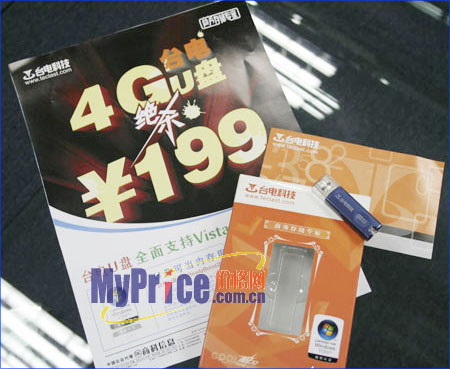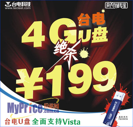 『myprice价格网3月1日消息』新年新气象,编辑今日得到消息,台电科技再次为大容量U盘的普及而发力,继率先将1G、2G的价格推向平民化,加速了其普及速度之后,拥有“移动存储专家”之称的台电U盘,为满足人们对更大容量U盘的需求,晶彩4G U盘竟打出了199元的绝杀价,可以说只需256M内存的价格,就可以体验4G U盘在Windows Vista操作系统下变成虚拟内存带来的性能体验和更大容量的U盘带来的移动存储新乐趣,非常超值!