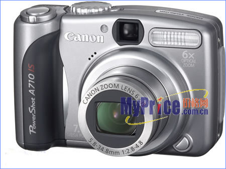 佳能A710 IS采用了1/2.5英寸的700万像素CCD,最大分辨率为3072×2304。使用焦距等效于传统35mm相机的35-210mm、最大光圈F2.8-F4.8的6倍光学变焦镜头,它的ISO为 80/100/200/400/800,快门为15-1/2000 秒。在A系列中,佳能首次给A710 IS配备了IS光学影像稳定器,确保长焦距手持拍摄照片的清晰度,避免因为抖动导致照片模糊不清。