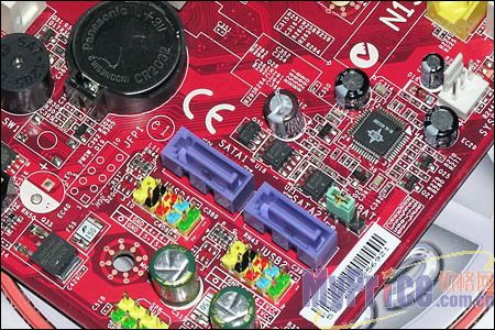 在存储接口方面,主板上提供的2个SATA II接口可以为用户带来高达3Gb/s的接口带宽。1个IDE接口更是兼顾了升级用户的老硬盘和光存储设备。