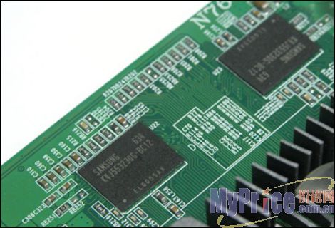 速配PCX7318GT PRO采用三星1.2ns高速显存,4颗显存组成了128M/128bit的规格,显存默认频率为1400MHz,而1.2ns GDDR3显存颗粒的理论频率为1600MHz,这款显卡还有一定的超频空间。
