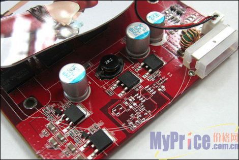 供电模块采用的是分离式供电设计,上面为GPU核心供电部分,使用了半封闭的电感线圈搭配大量铝壳液态电解电容,并使用了NeXsem科技出品的NX2415控制IC和6颗ANPEC的APM2506N Mosfet管,最大稳定提供90A的电流,对于核心功率大幅下降的1950 PRO来说,预留了极大的空间,保障了显卡的稳定运行。