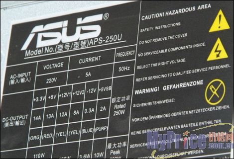 机箱附带的电源能够提供250W的额定输出功率,最大输出则能够达到300W。它拥有两路12V输出,拥有最大20A的输出能力,额定的250W电源对于小型系统来说足够了,电源提供了24pin的主供电接口以及一个4pin的辅助供电接口,驱动器供电方面则提供了3个大4pin,1个SATA供电和一个FDD供电,和mATX的设计非常匹配。