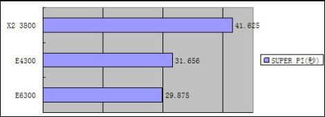 SuperPI 是大家最熟悉的测试软件了,Core 2自发布后在这方面表现表现就一直非常抢眼。E4300同E6300差距非常小,仅有1.781秒,但却大幅领先AMD X2 3800+。
