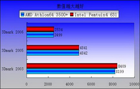 概述:以下是网吧用机中最为看重的测试,也就是图形性能的测试。我们先后进行的是3DMark 03、3DMark05、3DMark06的测试。从下面的测试成绩我们可以看到,Intel Pentium 4 631平台的成绩要略微领先于AMD Athlon 64 3500+,尽管优势不明显,但是仍然可以看出差距。可以说Intel Pentium 4 631是目前市面上销售的性能最强的单核心处理器,AMD Athlon 64 3500+ 要略逊一筹。